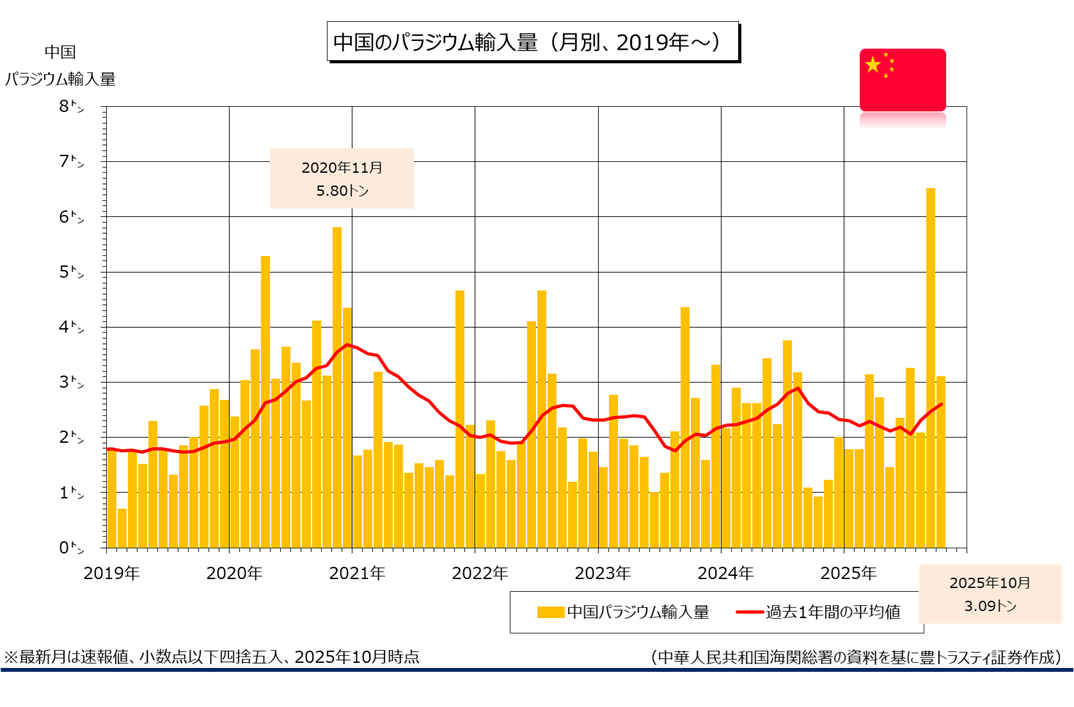10月中国パラジウム輸入量は前年同月から約3倍増加の3.09トンと、2ヶ月連続でプラスとなりました。ただ、少なくとも2009年以降で最高となった前月(6.51トン)は下回っております。2025年1-10月期累計では前年同期比13.3%増加の28.08トン。