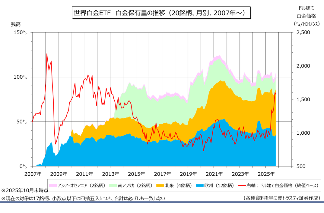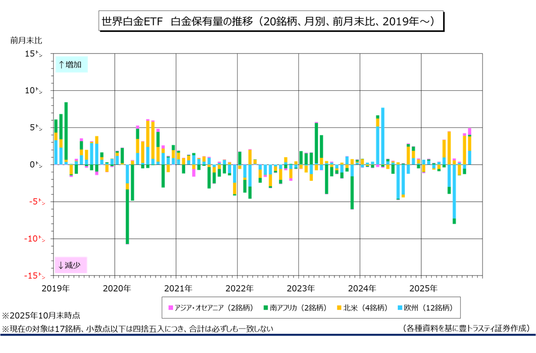 地域別で見てみると、全地域が増加。最も増加した地域は北米で、同1.94トン増と、2ヶ月連続で増加。世界最大の白金ETFであるアバンディーンは同0.29トン減となったものの、スプロットが同1.76トン増となっております。