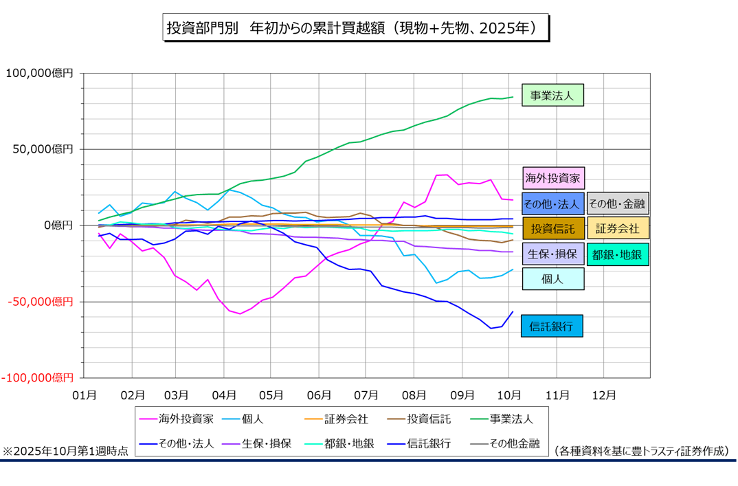 事業法人は1255億円の買い越し。年初からの累計は8兆4368億円の買い越し。