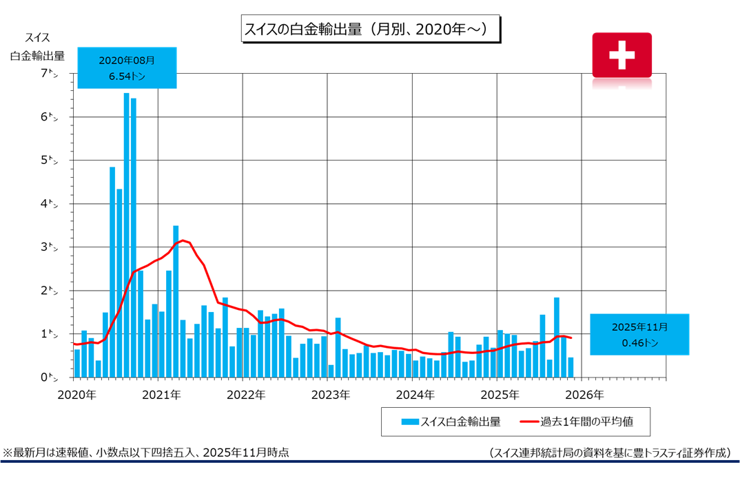 スイス連邦統計局によると、11月スイス白金輸出量(速報値)は前年同月比50.5%減の0.46トンでした。5ヶ月ぶりにマイナスに転じております。前月(0.92トン)も下回り、8月(0.41トン)以来3ヶ月ぶり低水準となりました。2025年1-11月期累計では前年同期比53.8%増加の10.24トン。