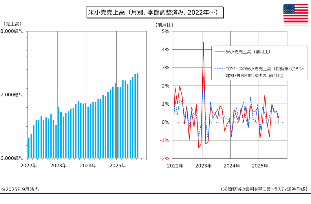 米商務省が11月25日に発表した9月米小売売上高(季節調整済み)は7332億5800万ドルと、前月比0.2%増加。4ヶ月連続でプラスとなったものの、市場予想(0.3%増)はやや下回りました。GDPの消費支出に最も近いとされる自動車やガソリン、建材、食品サービスを除いたコア小売売上高は前月比0.1%減少。