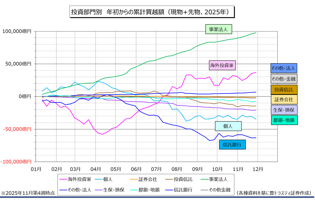 事業法人は1636億円の買い越しと、9週連続で買い越し。年初からの累計は9兆7889億円の買い越し。