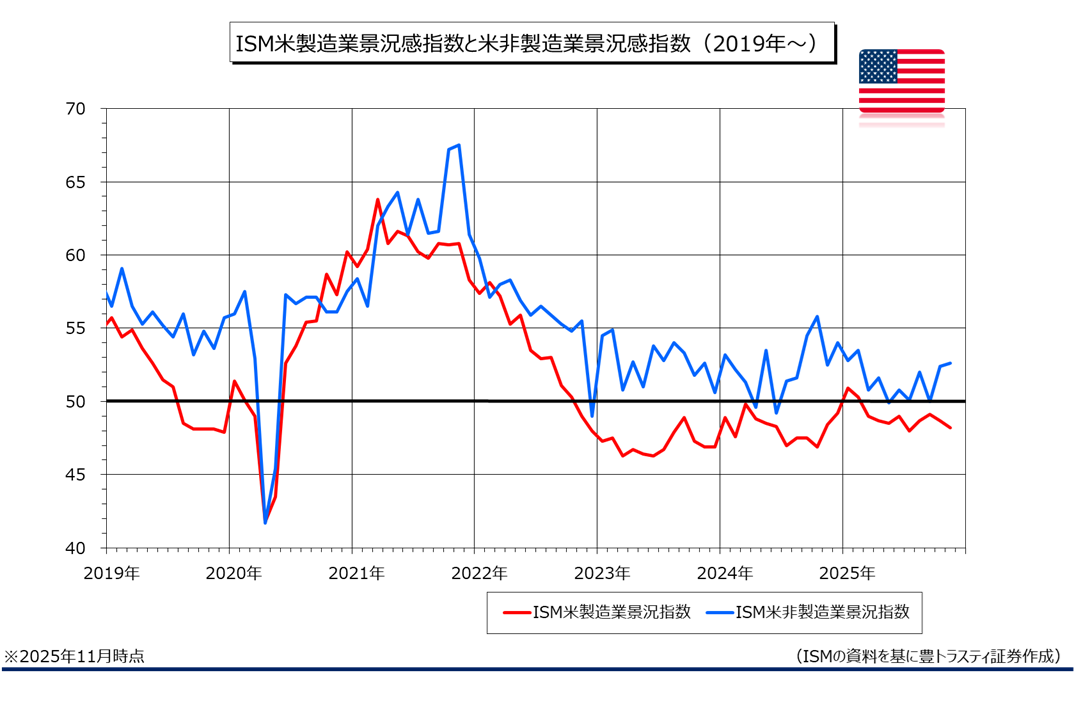 米サプライマネジメント協会(ISM)が12月1日に発表した11月米製造業景況感指数は48.2と、前月(48.7)から0.5ポイント低下。市場予想(49.0)も下回り、2ヶ月連続で低下しております。景況拡大と縮小の分岐点である50は9ヶ月連続で下回りました。新規受注や雇用が減速するなど、景気の不確実性が強まっている模様。