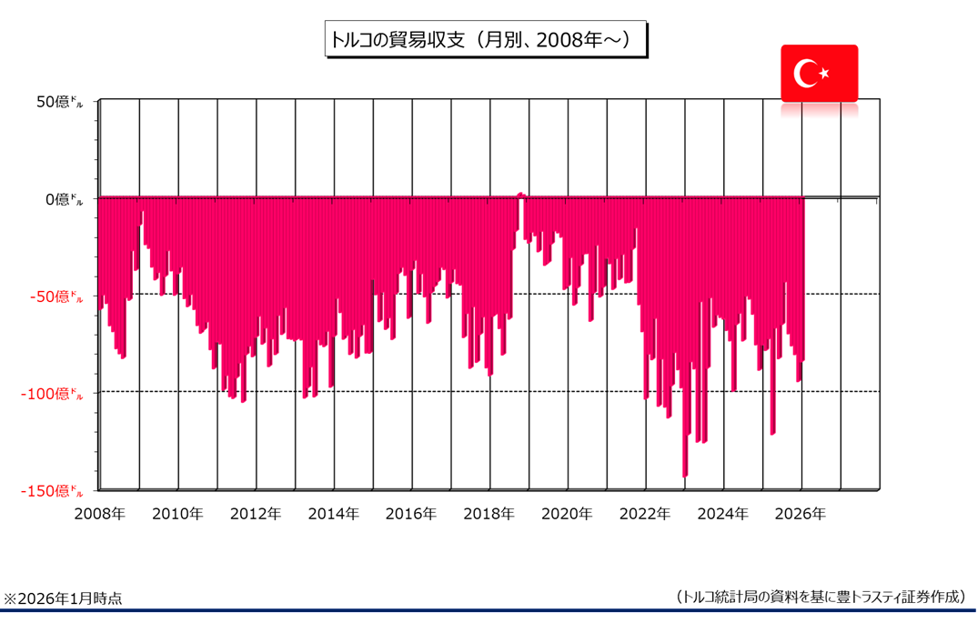 なお、同局が2月26日に発表した1月トルコ貿易収支は83億7954万ドルの赤字でした。輸入が伸びた一方、輸出は減少し、赤字幅は前年同月(75億1068万ドルの赤字)から拡大しております。(前月は93億8933万ドルの赤字)。