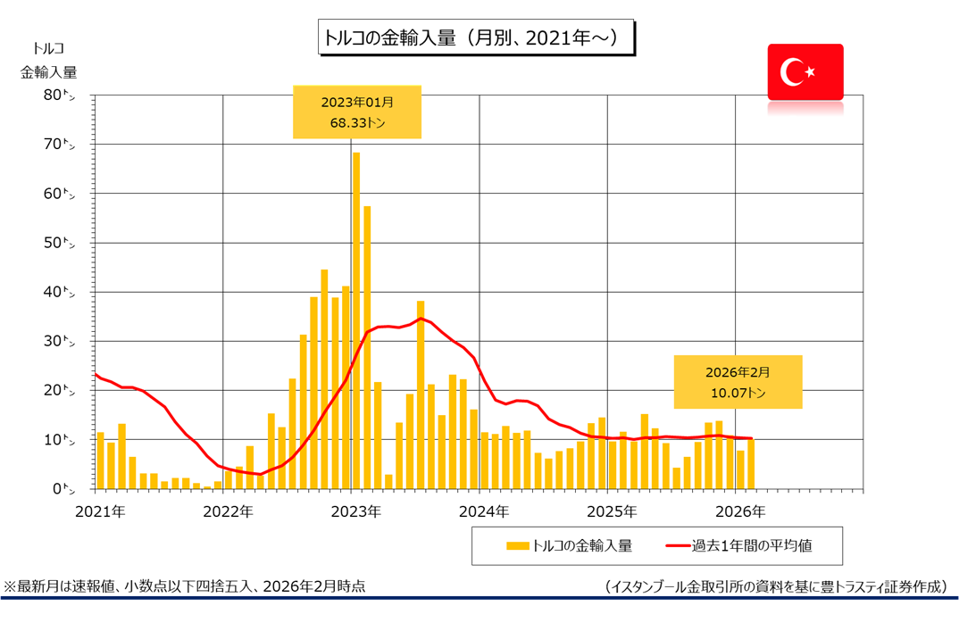 イスタンブール金取引所の統計によると、2月トルコ金輸入量は前年同月比13.4%減少の10.07トンでした。3ヶ月連続でマイナスとなったものの、昨年8月(6.50トン)以来の低水準となった前月(7.79トン)は上回りました。2026年1-2月期累計では前年同期比16.1%減の17.86トン。