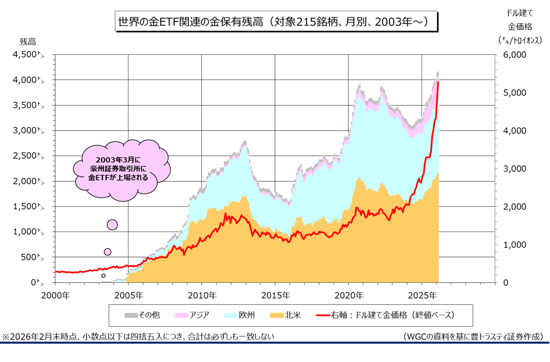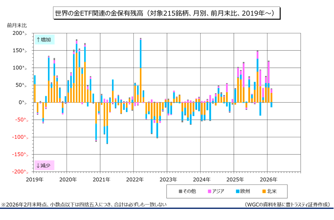 産金業界団体ワールド・ゴールド・カウンシル(WGC)が3月5日に公表した「Gold-Backed ETF FLOWS」によると、2月末の世界の金ETF(上場投資信託)関連(215銘柄)の金保有残高は前月末比26.05トン増加の4170.71トンと、9ヶ月連続で増加。月末の残高としては、前月に続いて過去最高を更新しました。