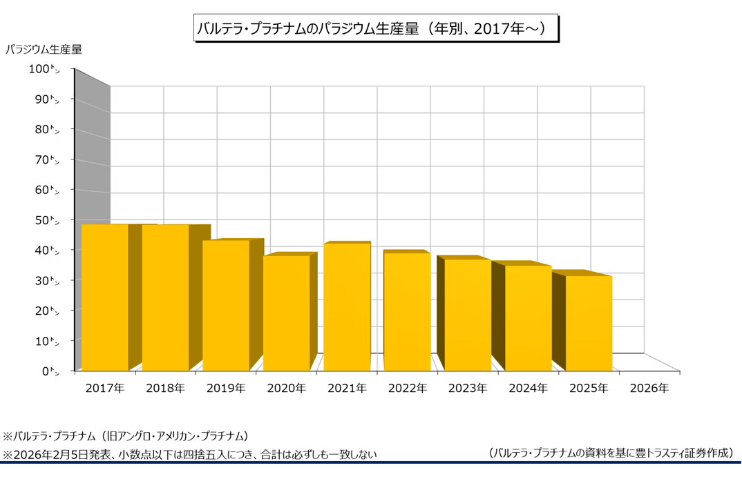 パラジウム総生産量は同2.6%減の8.53トンと、16四半期連続でマイナスとなりました。ただ、前期(8.09トン)を上回り、2024年第4四半期(8.76トン)以来の高水準となっております。過去5年平均9.19トン。バルテラ・プラチナム(Valterra Platinum)は、世界第2位の白金鉱山会社。