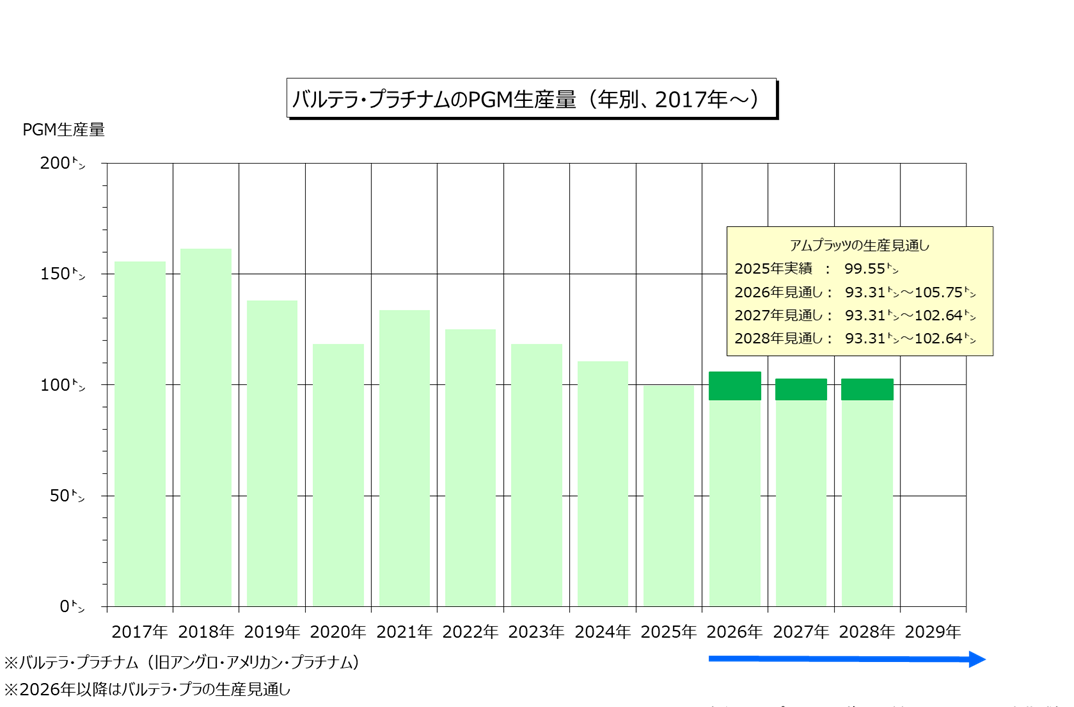 南アフリカの白金生産大手バルテラ・プラチナム(旧アングロ・アメリカン・プラチナム)が2月5日に発表したレポートによると、同社の2025年PGM総生産量(鉱山生産とは仕掛品在庫の合計)は前年比9.9%減少の99.55トンでした。マイナスは4年連続。なお、バルテラは2月25日に発表した決算発表で、2026年の生産量を93.31トン~105.75トン、2027年は93.31トン~102.64トン、2028年は93.31トン~102.64トンと予測。2025年実績を下回ると想定しております。