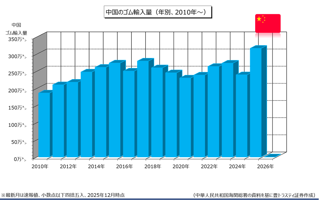 中国税関総署の統計によると、2025年月中国ゴム輸入量は前年比32.3%増加の316.52万トンでした。少なくとも統計が遡れる2007年以降で最高を更新しております。なお、昨年12月は前年同月比52.8%増加の39.22万トンでした。2017年12月(34.44トン)以来の高水準となっております。