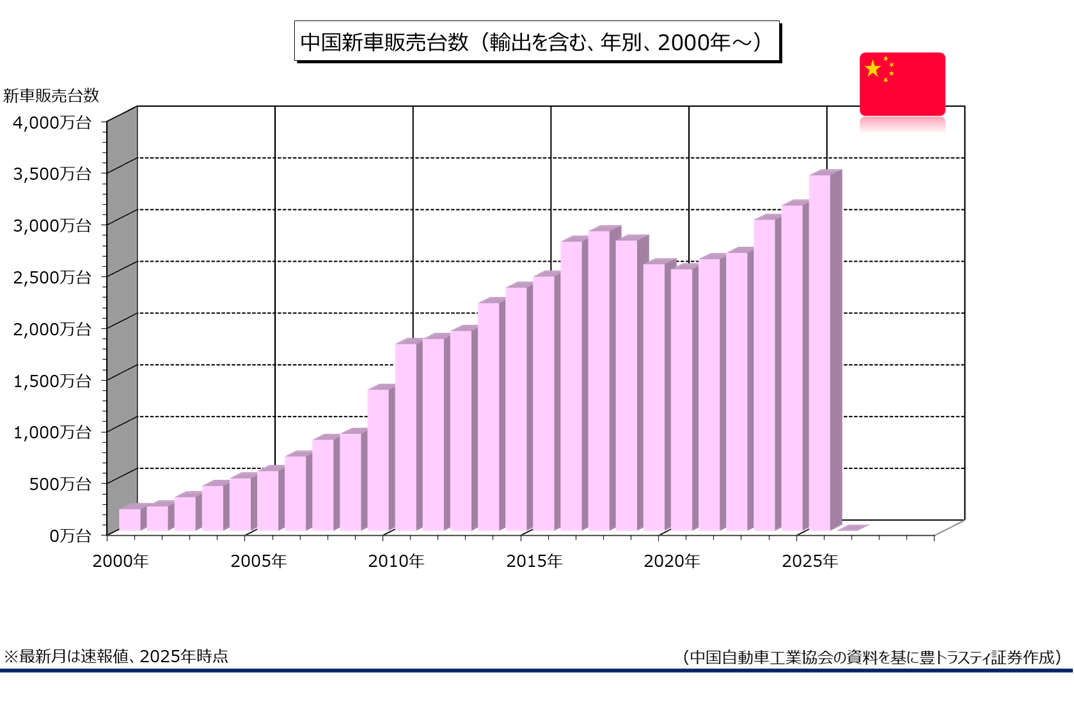 同協会は2026年中国新車販売台数(輸出含む)を前年比1%増の3475万台と予測。輸出は4.3%増の740万台を見込んでおります。なお、2026年はNEVの購入の際にあった車両取得税の全額の免税が半額に縮小されます。
