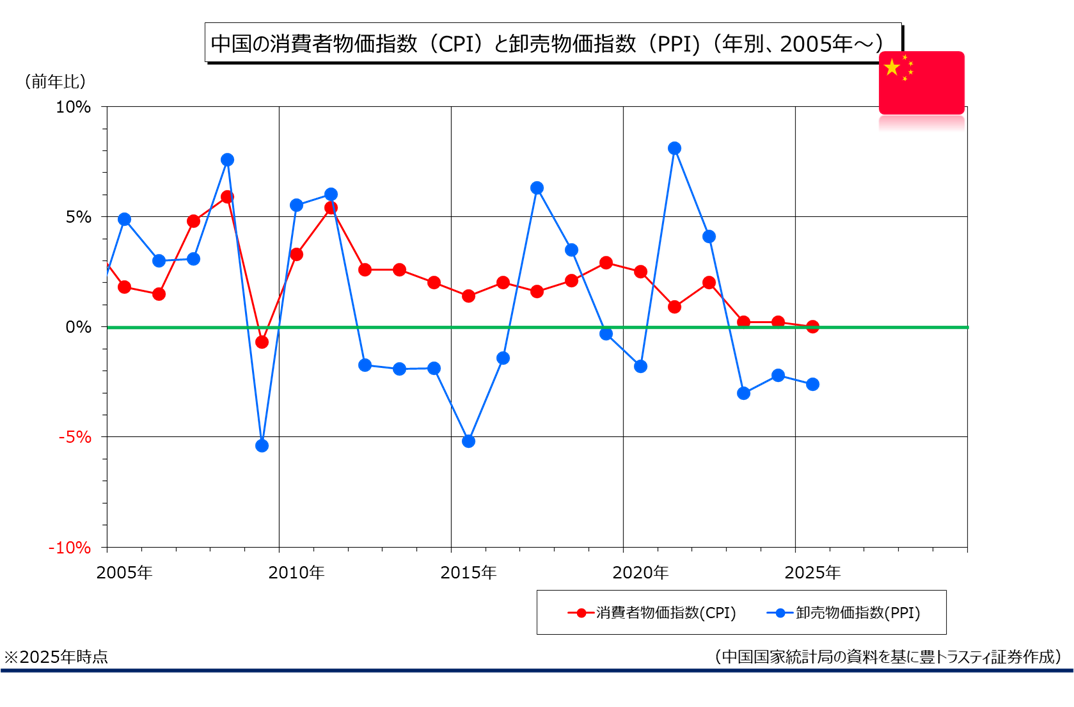中国国家統計局が1月9日に発表した2025年中国消費者物価指数(CPI)は、前年比0.0%と横ばいでした。金融危機の影響でマイナスだった2009年以来16年ぶり低水準となっております(前年は0.2%上昇)。景気が冷え込む中、デフレ懸念は一段と強まっております。中国政府は「2%前後」の上昇目標を掲げていたものの、遠く及ばず。