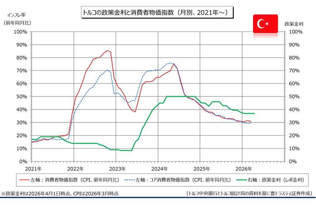 トルコ統計局が4月3日に発表した3月トルコ消費者物価指数(CPI)は、前年同月比30.87%上昇。伸び率は前月(31.53%上昇)を下回り、6ヶ月ぶりに鈍化しております。前月比では1.94%上昇(前月は2.96%上昇)。