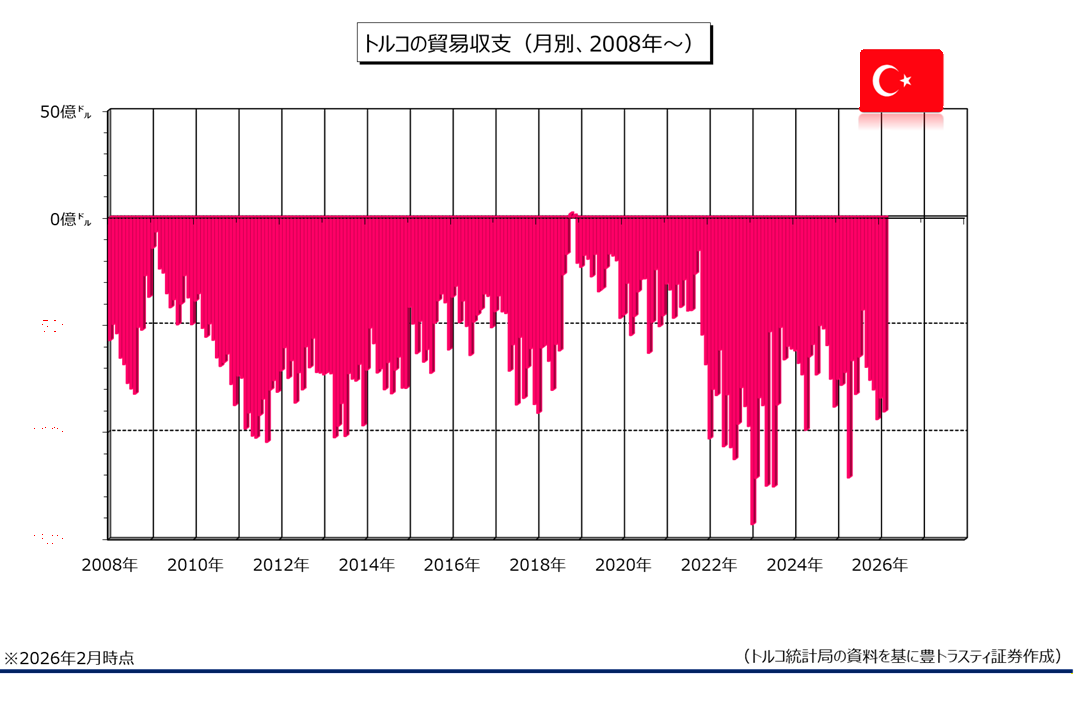 なお、同局が3月31日に発表した2月トルコ貿易収支は90億3134万ドルの赤字でした。輸入の伸びが輸出を上回り、赤字幅は前年同月(77億9559万ドルの赤字)から拡大しております。(前月は83億8384万ドルの赤字)。