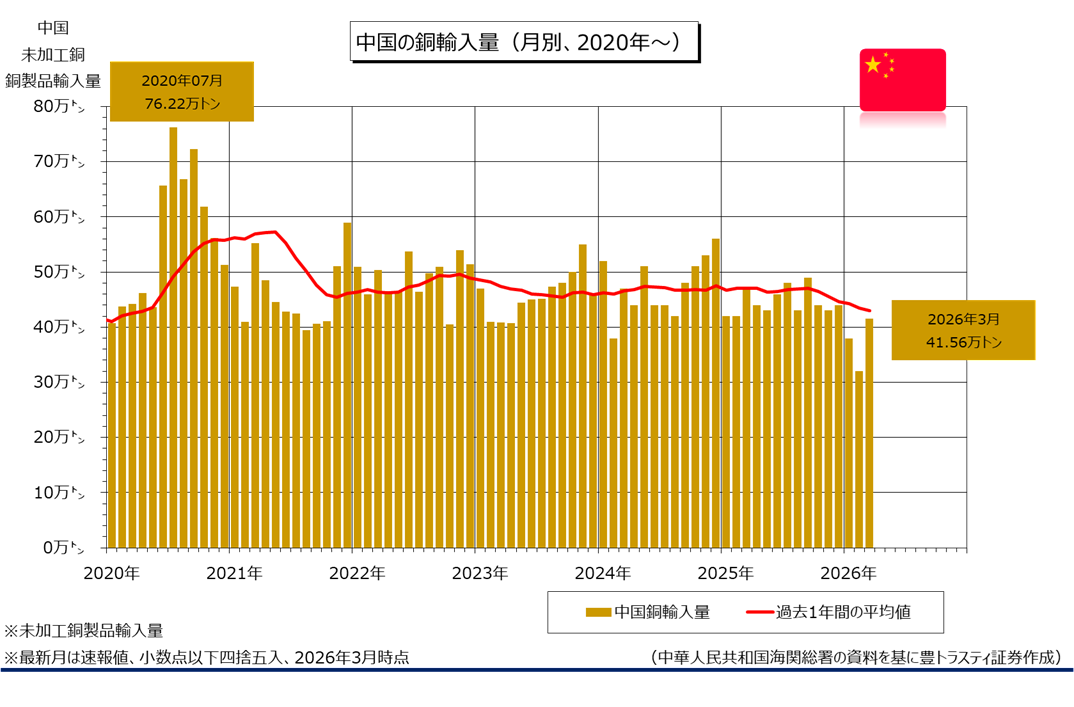 3月中国銅輸入量(アノード、製錬銅、銅合金、半完成銅製品を含む)は前年同月比11.6%減少の41.56万トンでした。6ヶ月連続でマイナスとなっております。2026年1-3月期では前年同期比14.2%減の111.52万トン。