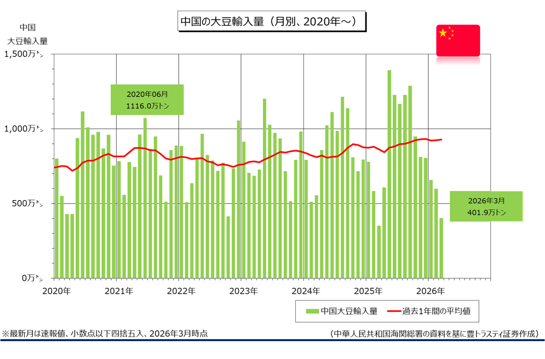 3月中国大豆輸入量は前年同月比14.8%増加の401.9万トンでした。昨年3月(350.0万トン)以来の低水準に留まっております。