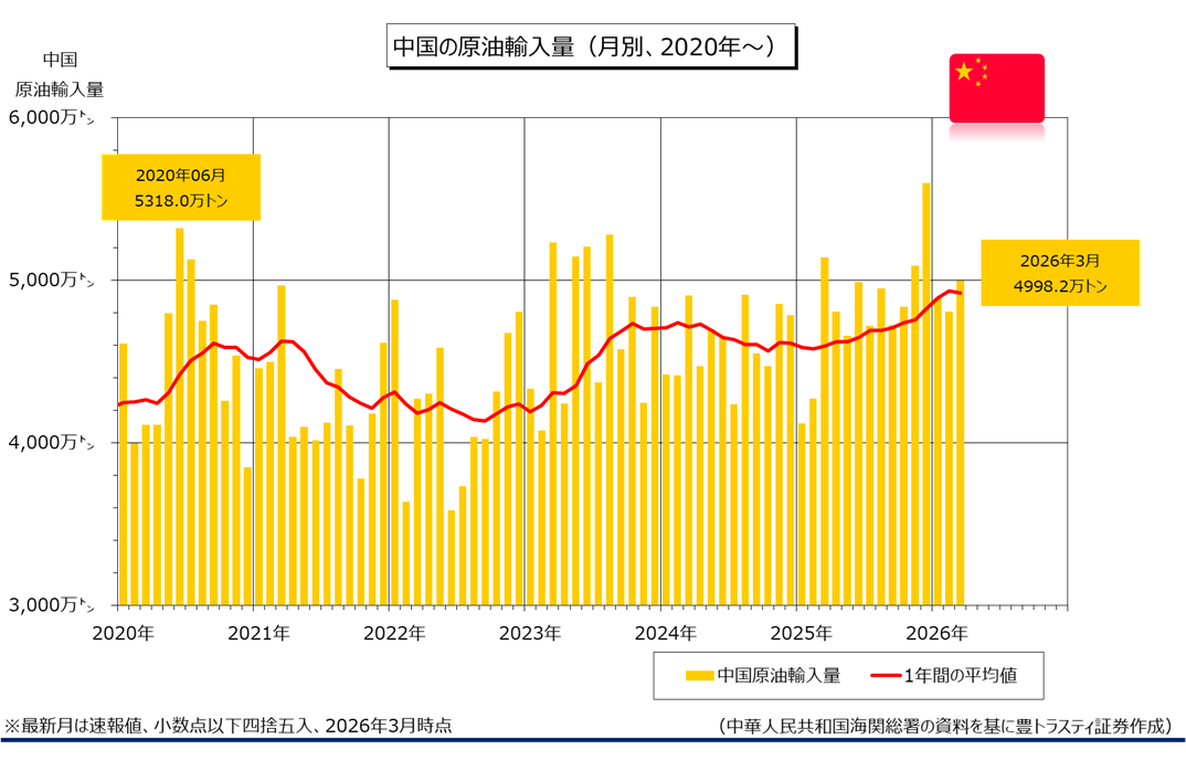 3月中国原油輸入量は前年同月比2.8%減少の4998.2万トンでした。昨年5月以来のマイナスに転じております。中国は原油輸入の半分を中東産に依存しており、イランによる事実上のホルムズ海峡封鎖で安定調達がしにくくなった模様。2026年1-3月期では前年同期比8.6%増の1万4684.0万トン。