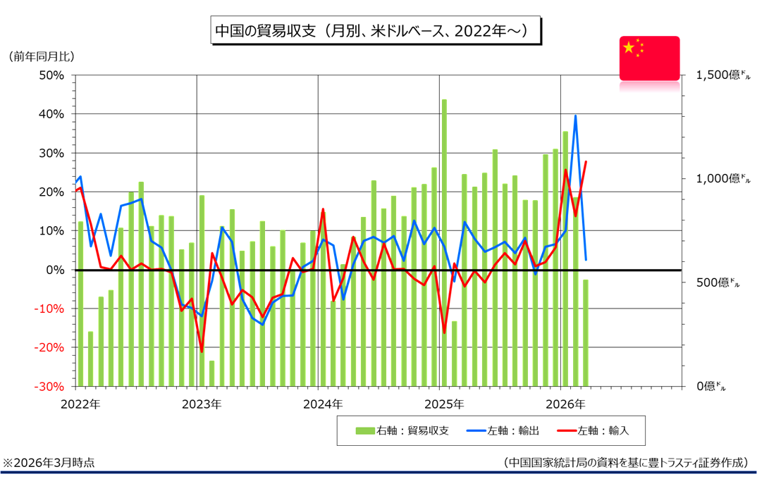 中国税関総署が4月14日に発表した3月期中国貿易統計(ドル建て)によると、輸出から輸入を引いた貿易黒字は511.3億ドルと、昨年2月以来(311.9億ドル)の低水準に留まっております。輸出は前年同月比2.5%増の3210.3億ドルと、春節(旧正月)の影響をならした2026年1-2月期(前年同期比21.8%増)から大幅に鈍化。中東情勢の悪化に伴う世界的なサプライチェーン(供給網)の混乱が響いた模様。一方、輸入は前年同月比27.8%増の2699.0億ドルと、2026年1-2月期(前年同期比19.8%増)から拡大しております。