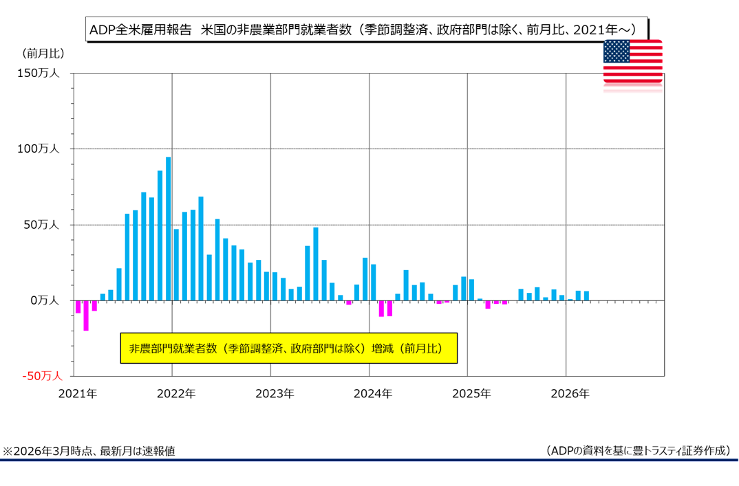米民間雇用サービス会社ADPが4月1日に発表した3月全米雇用報告によると、非農業部門雇用者数(季節調整済、政府部門は除く)は前月比6.2万人増加。増加幅は前月(6.6万人増)をやや下回ったものの、市場予想(4.0万人増)は上回っております。