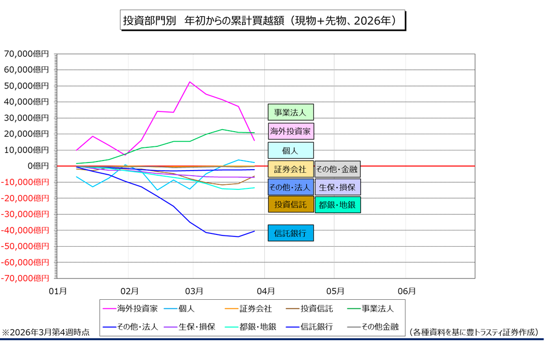 事業法人は304億円の売り越しと、2週連続で売り越し。年初からの累計は2兆0851億円の買い越し。現物は44億円の売り越しと、2週連続で売り越しております。四半期末特有の動きとみられております。