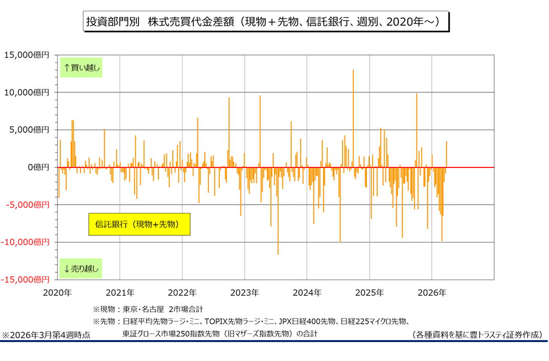 年金基金の売買動向を反映するとされる信託銀行は3453億円の買い越しと、12週ぶりに買い越しに転じました。年初からの累計は4兆0559億円の売り越し。現物は1034億円の売り越しと、12週連続で売り越した一方、先物は4487億円の買い越しと、買い越しに転じました。