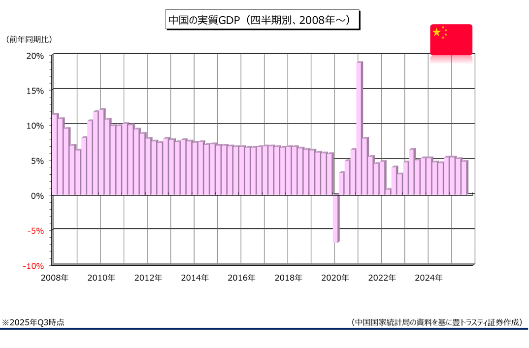 中国国家統計局が発表した2025年7-9月期中国GDP(国内総生産)は、物価変動の影響を除いた実質ベースで前年同期比4.8%増と、市場予想(4.6%増)を上回ったものの、伸び率は前期(5.2%増)から減速しました。