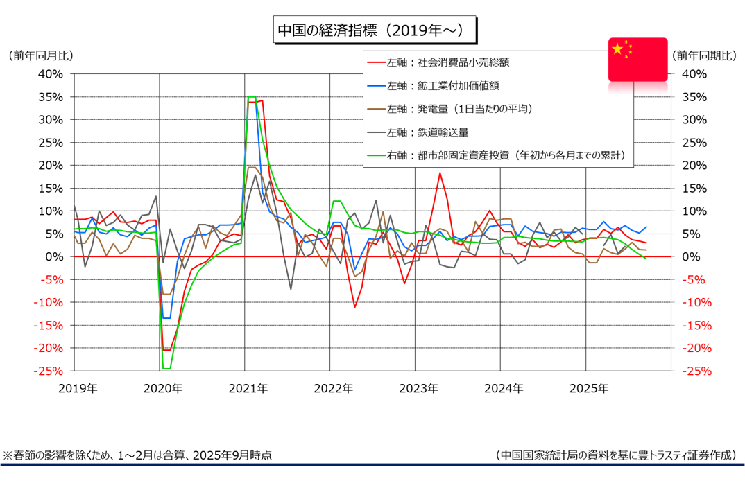幅広い投資動向を示す2025年1-9月期中国都市部固定資産投資は前年同期比0.5%減と、1-6月期(同2.8%増)から鈍化。2020年8月以来のマイナスに転じております。