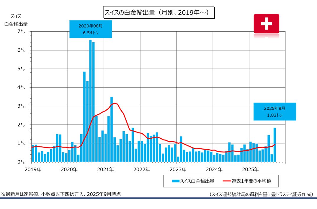 スイス連邦統計局によると、9月スイス白金輸出量(速報値)は前年同月(0.39トン)から4.7倍増の1.83トンでした。3ヶ月連続でプラス。前月(0.41トン)を上回り、2021年10月(1.84トン)以来の高水準となっております。2025年1-9月期累計では前年同期比77.9%増加の8.86トン。