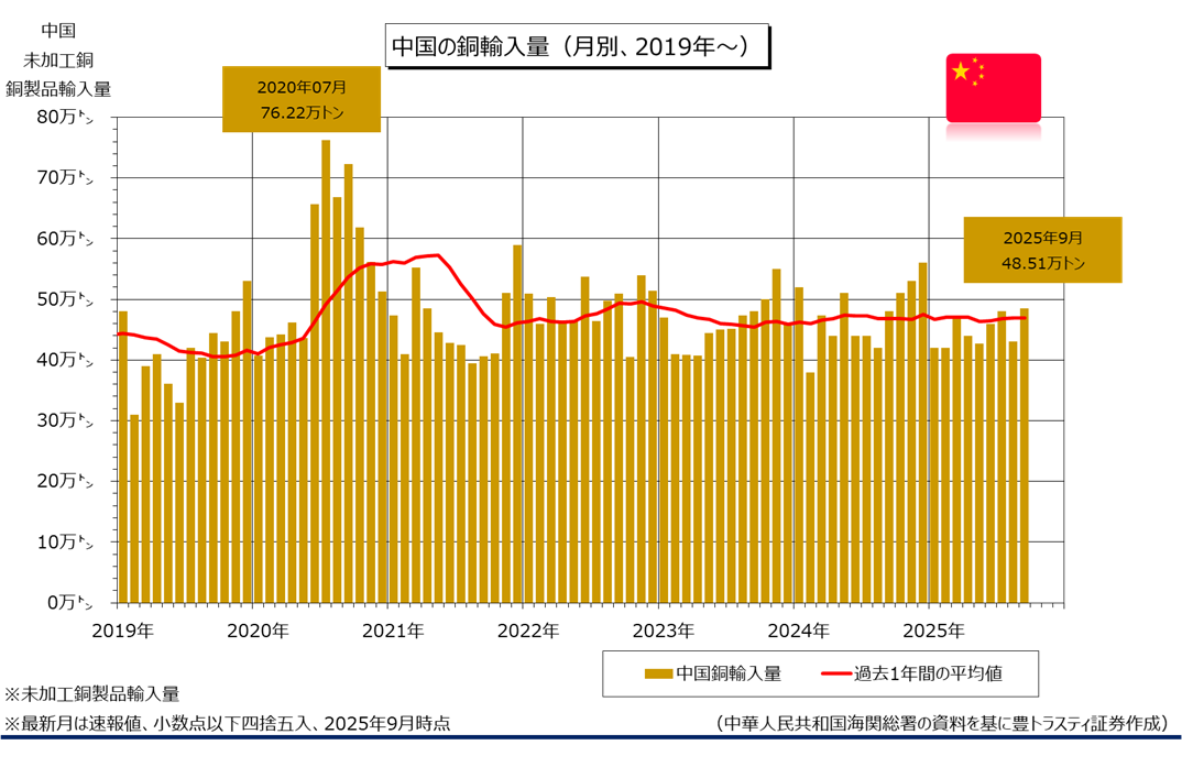 9月中国銅輸入量(アノード、製錬銅、銅合金、半完成銅製品を含む)は、前年同月比1.1%増加の48.51万トンと、4ヶ月連続でプラスとなっております。2025年1-9月期累計では前年同期比1.7%減の401.86万トン。