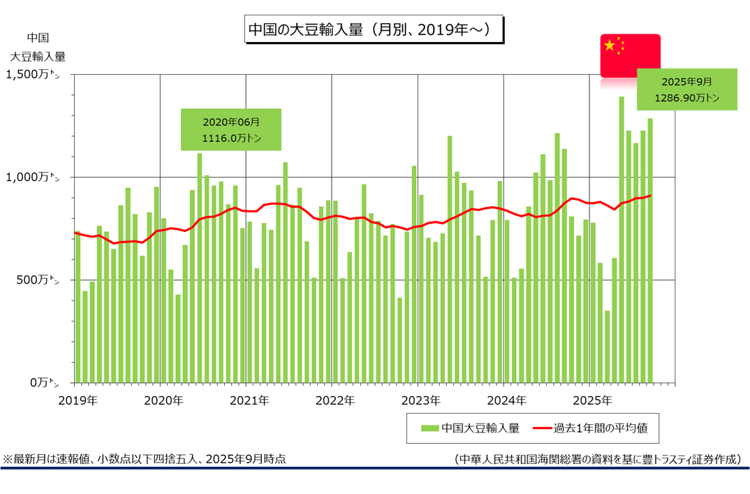 9月中国大豆輸入量は前年同月比13.2%増加の1286.90万トン。5ヶ月連続でプラスとなり、9月としては過去最高となっております。2025年1-9月期累計では前年同期比5.3%増の8618万トン。中国は米国産大豆の調達を控える一方、ブラジル産を中心に南米からの輸入を強化しております。