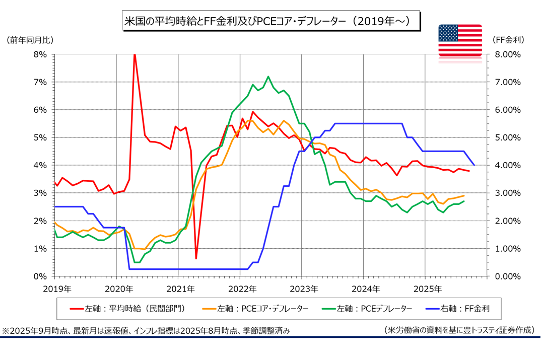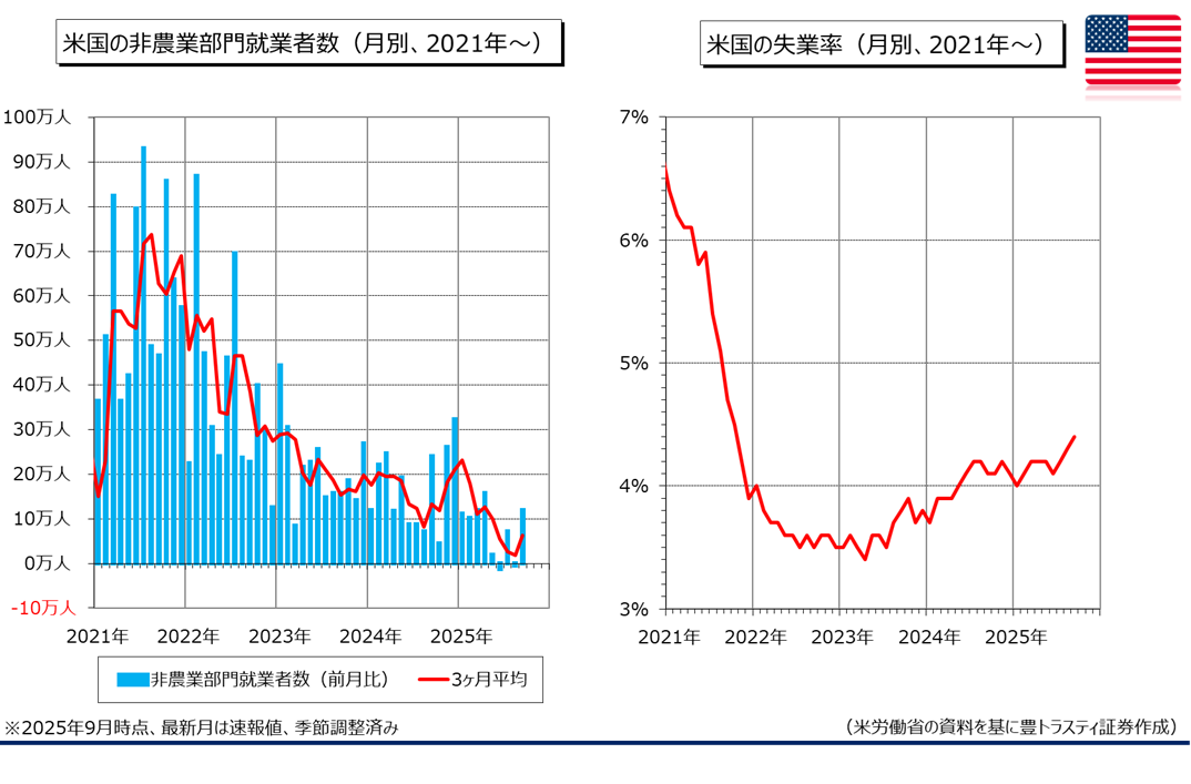 インフレに影響する平均時給は前年同月比3.8%上昇。伸び率は前月(3.8%上昇)から横ばい。前月比では0.2%上昇(前月は0.4%上昇)。9月雇用統計は当初、10月3日に公表される予定だったものの、米政府機関の一部閉鎖の影響で発表が遅れていました。