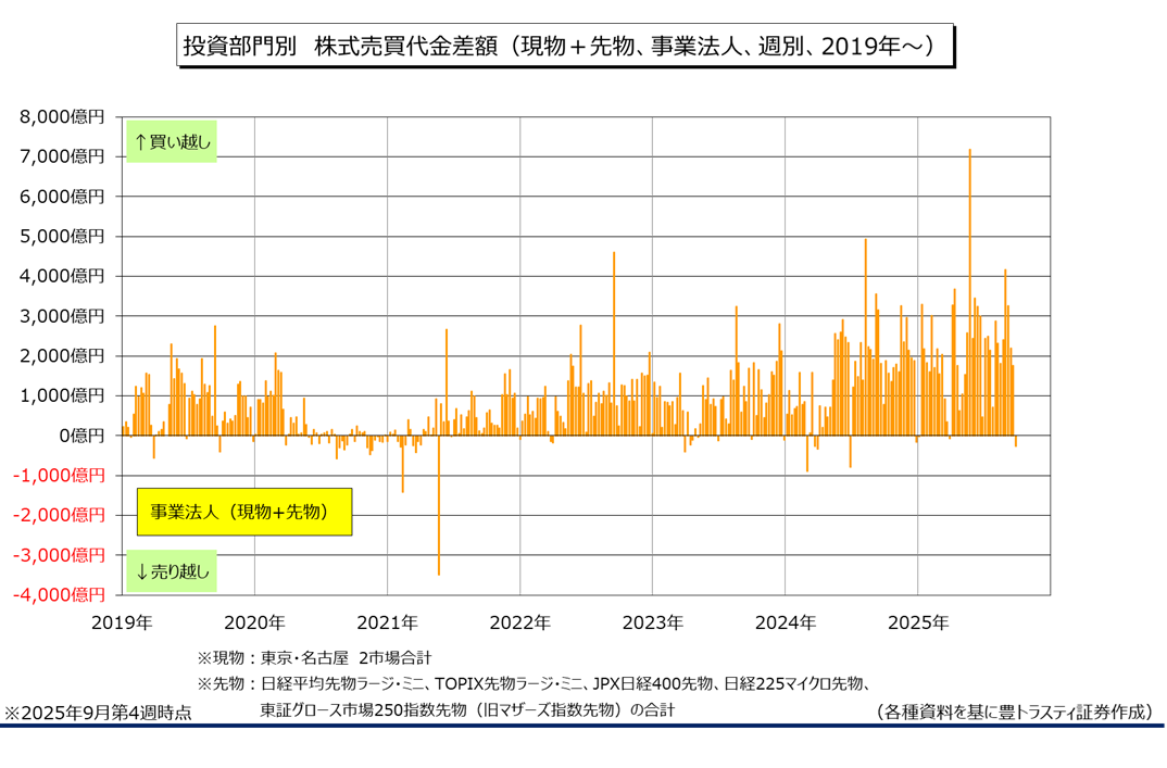 事業法人は264億円の売り越しと、26週ぶりに売り越しに転じました。年初からの累計は8兆3112億円の買い越し。