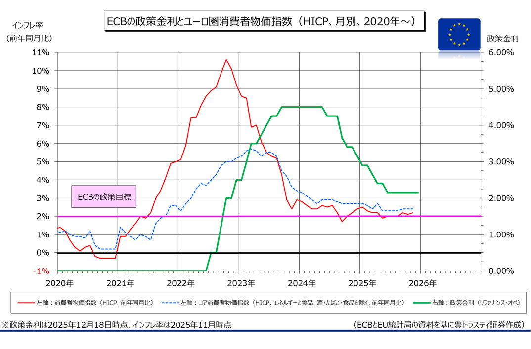 欧州中央銀行(ECB)は12月18日に定例理事会を開催し、政策金利を据え置くことを全会一致で決定しました。据え置きは7月、9月、10月会合に続いて4会合連続。物価が目標近辺で推移する中、現行の金利水準を維持することが適切と判断した模様。