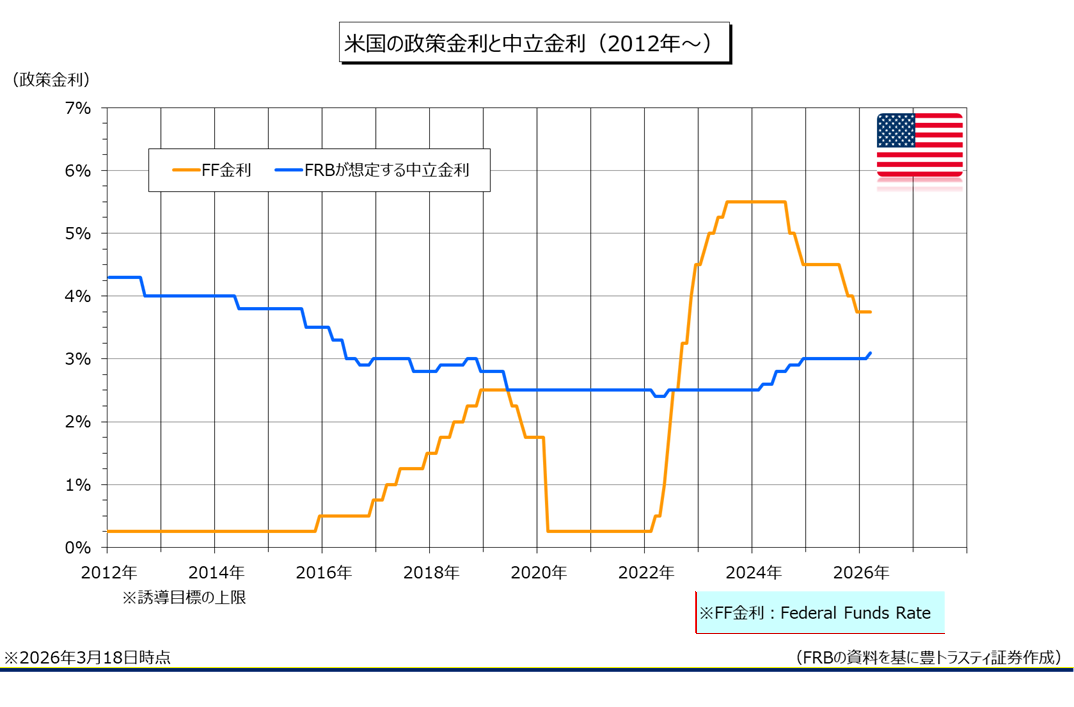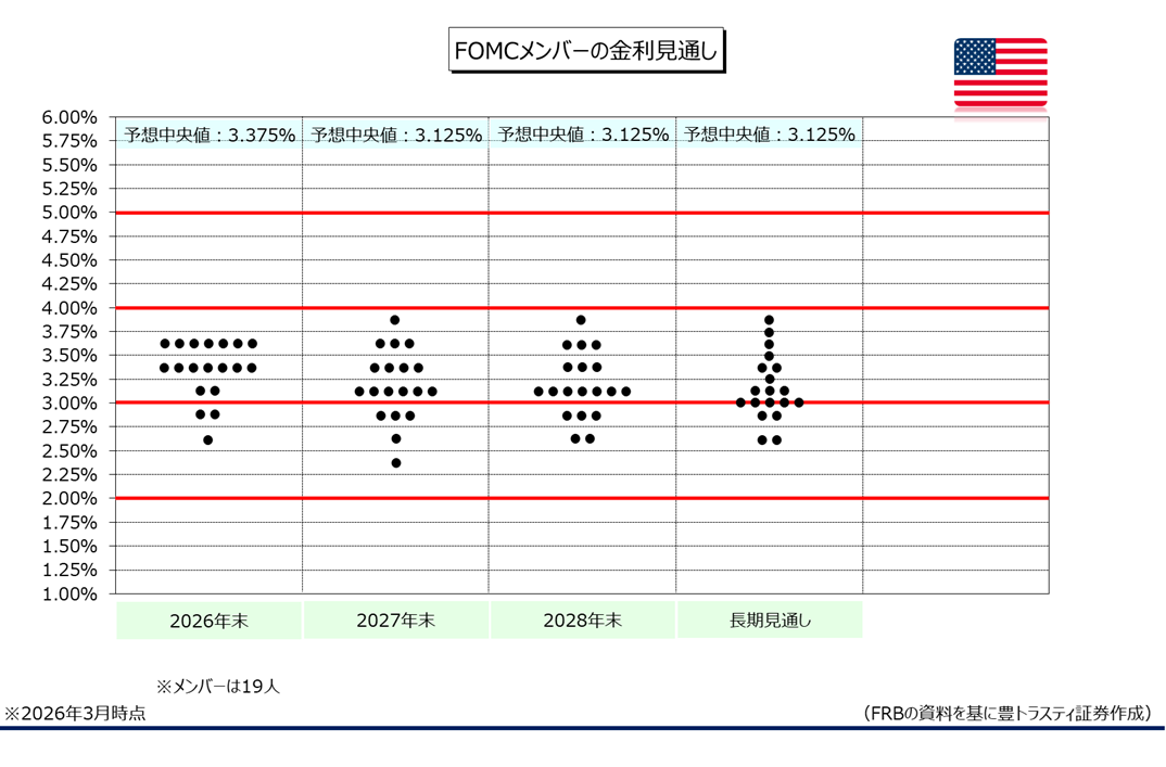 なお、2027年末のFF金利見通し中央値は年3.125%と、年1回の利下げを想定(昨年12月時点の見通しは年3.125%、年1回の利下げを想定)、2028年末のFF金利見通し中央値は年3.125%(昨年12月時点の見通しは年3.125%)、長期見通し(景気を熱しも冷やしもしない「中立金利」)は3.125%(昨年12月時点の見通しは3.000%)となっております。