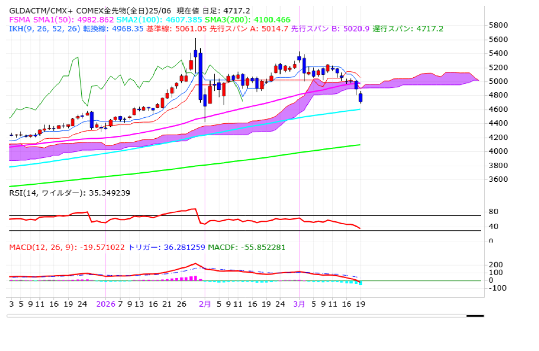 昨晩のNY金(中心限月)は、前営業日比112.00ドル安の4896.20ドルで終了。終値では2月19日以来、約1ヶ月ぶりに5000ドルの大台を割り込んでおります。中東情勢の緊迫化に伴い、「有事のドル買い」の動きが続いていることに加えて、FRBによる早期利下げ観測が後退する中、引き続き軟調な地合いが継続。50日平均線を維持出来なかったことで下げ幅を拡大し、4809.3ドルまで下げる場面も見られております。なお、現在取引中の時間外取引も続落しており、一目均衡表の雲を下抜けて4700ドルを下回ってきております。