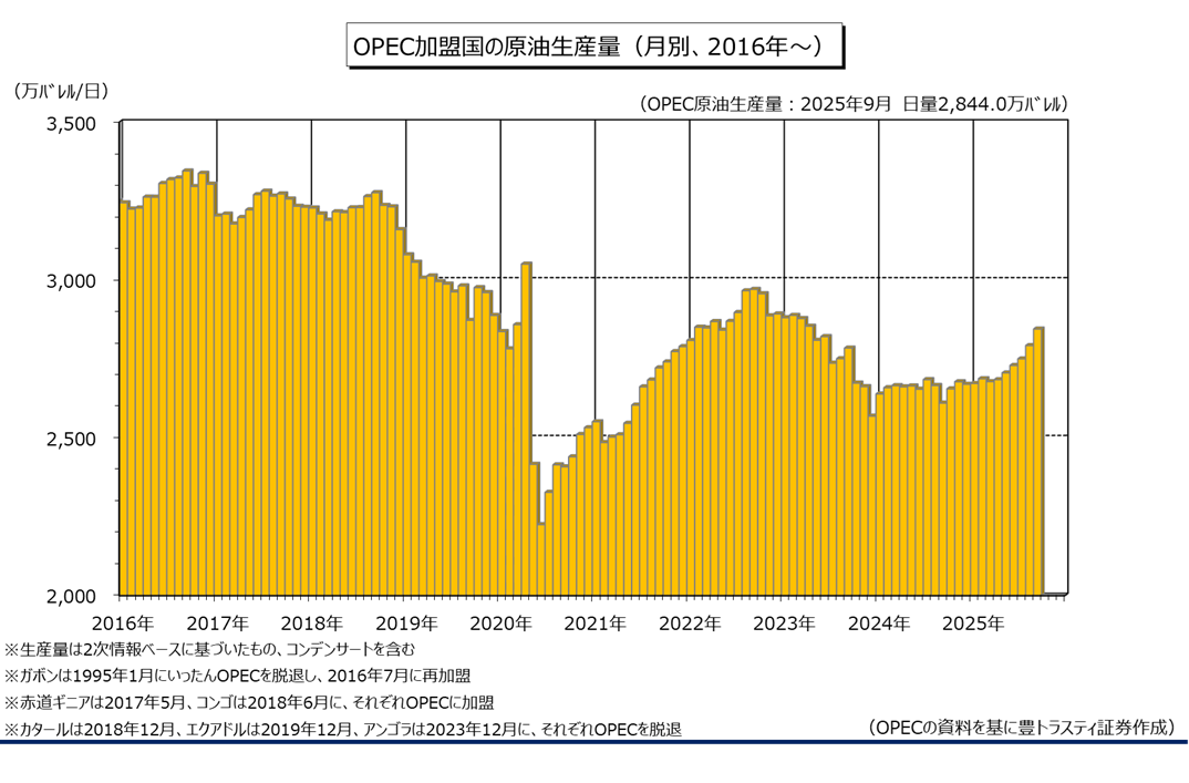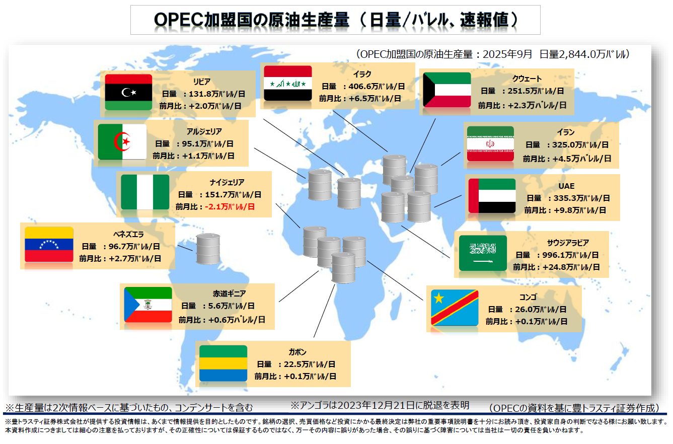 石油輸出国機構(OPEC)が10月13日に公表した月報によると、9月のOPEC加盟国の産油量は前月比日量52.4万バレル増加の日量2844.0万バレルと、6ヶ月連続で増加となりました。加盟12ヶ国中、増加した国は11ヶ国。減少した国は1ヶ国となっております。
