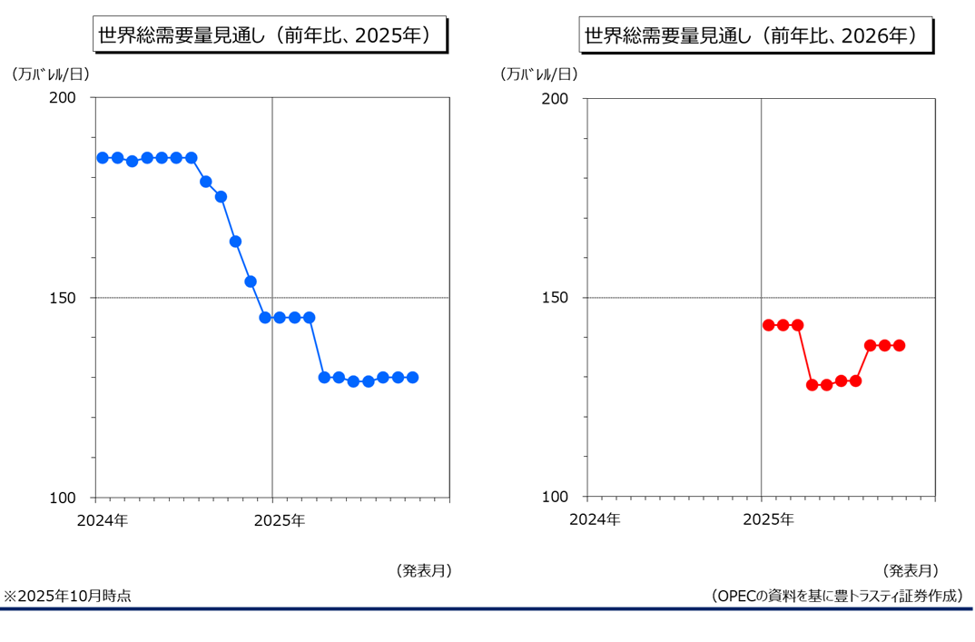 2025年世界石油需要は前年比日量130万バレル増の日量1億0514万バレル、2026年は前年比日量138万バレル増の日量1億0652万バレルと、3ヶ月連続で前月見通しで据え置いております。
