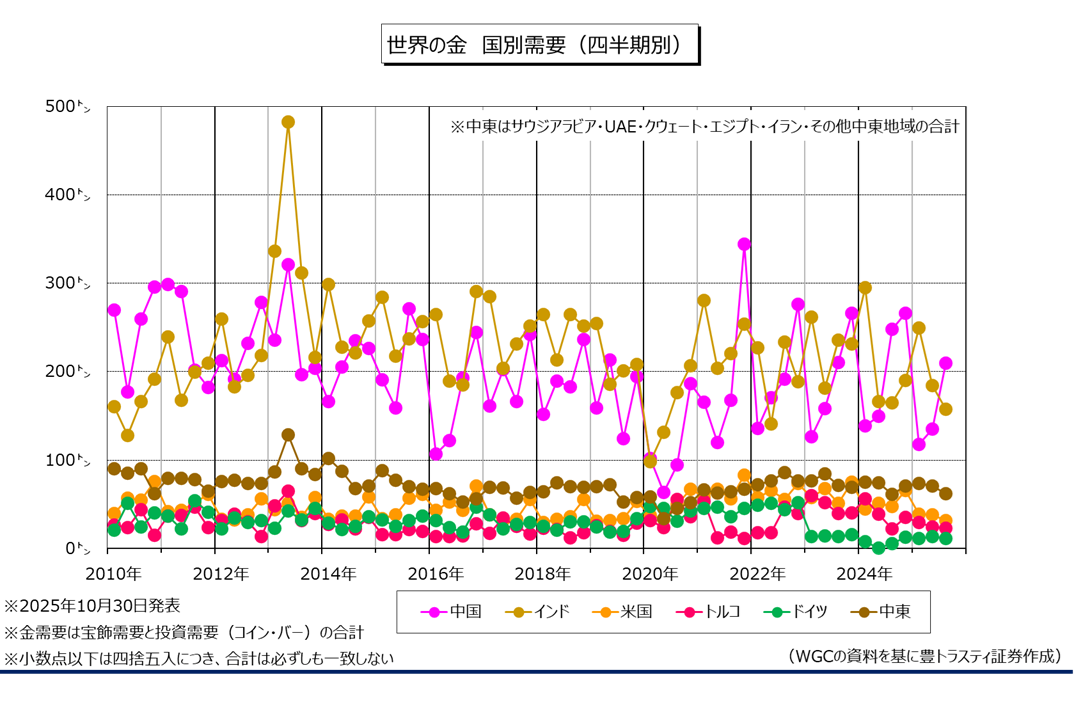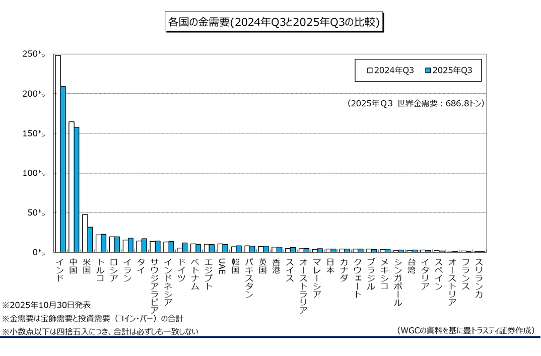 産金業界団体ワールド・ゴールド・カウンシル(WGC)が10月30日に公表した「Gold Demand Trends」によると、2025年7-9月期の世界金需要(宝飾品と投資需要の合計)は前年同期比5.9%減少の686.8トンと、9四半期連続でマイナスとなりました。