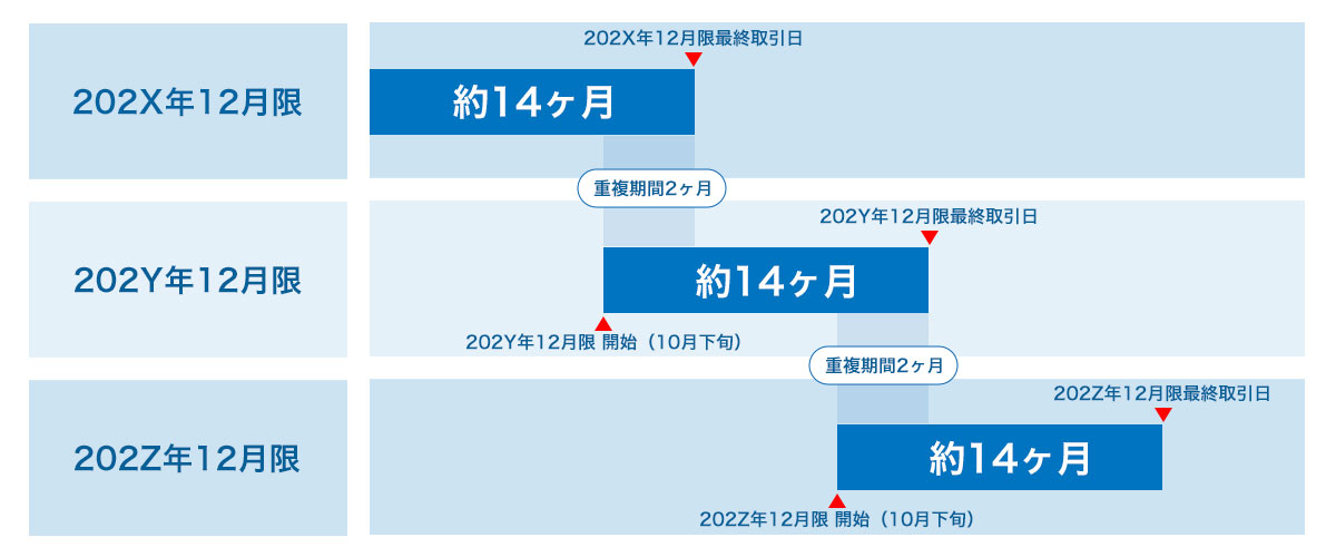 限月取引 翌年12月限月のみの1限月制(1年2か月、10月から12月までの間は2限月制)