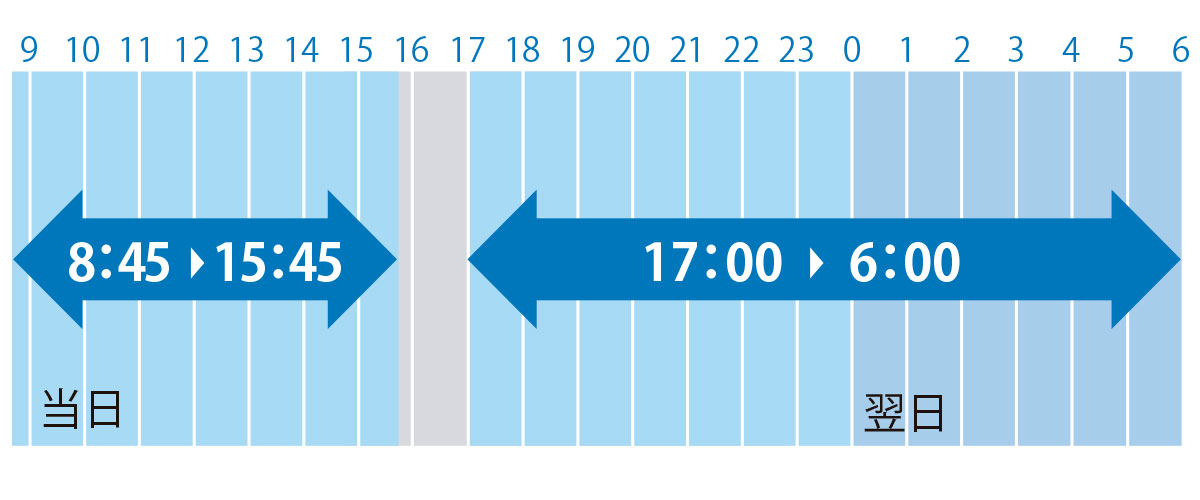 取引時間は、日中では8:45~15:45、夜間では17:00 ~翌日6:00です。海外イベント(米雇用統計の発表等)の時間帯も機動的な取引を行うことができます。