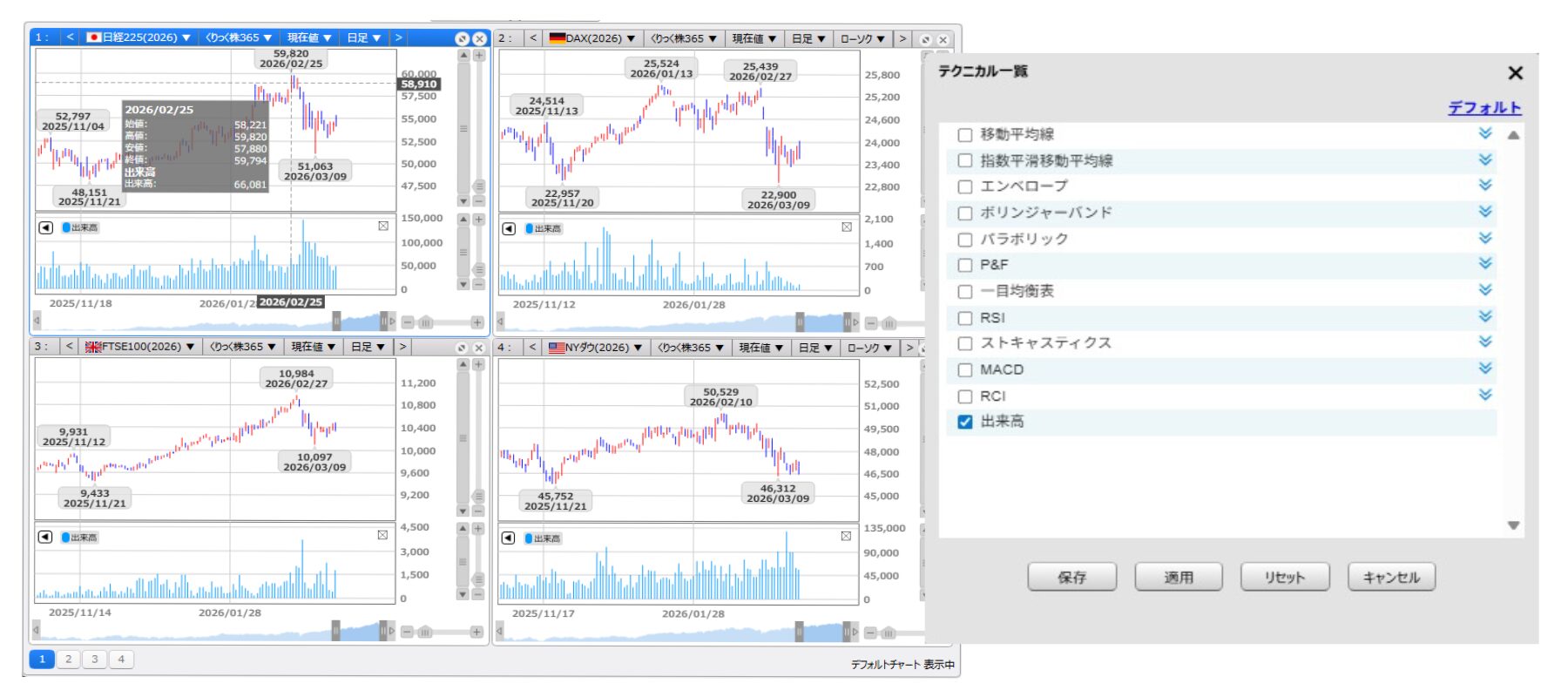 最大4分割でチャートを表示することができ、各種テクニカル指標にも対応しています。