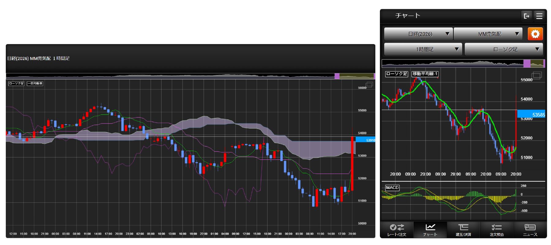 | 対応テクニカル指標 | 移動平均線、指数平滑移動平均線、エンベローブ、ボリンジャーバンド、パラボリック、P&F、一目均衡表、 RSI、ストキャスティクス、 MACD、RCI、出来高 |