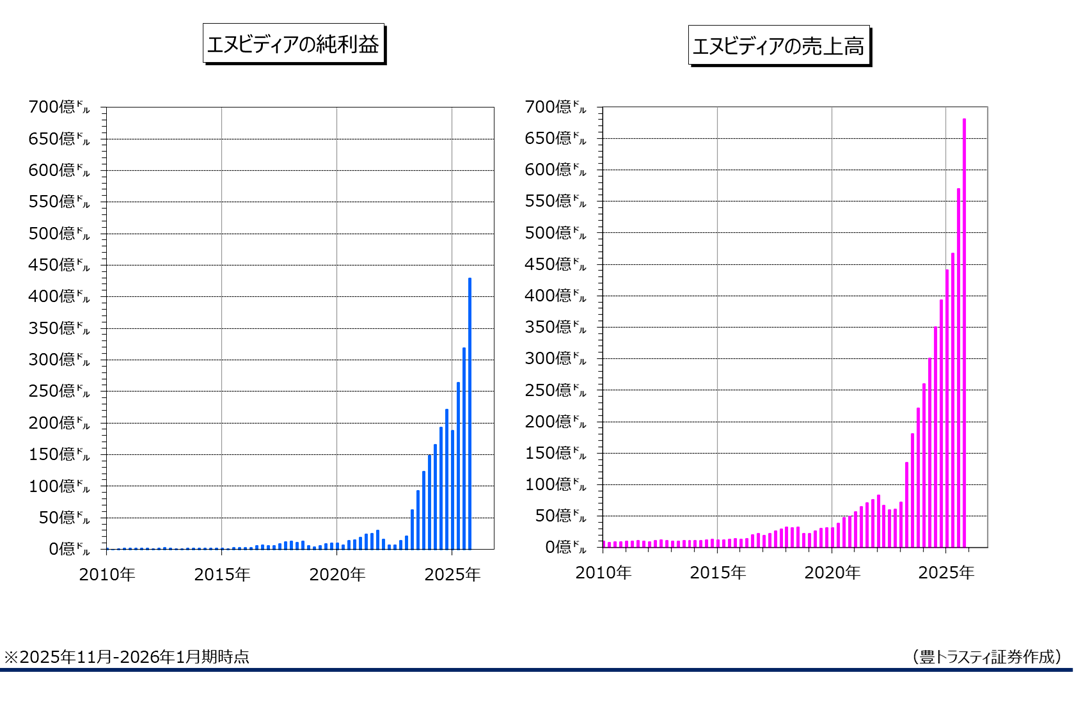 米半導体大手エヌビディアが2月25日に発表した2025年11月-2026年1月期決算は売上高が前年同期比73%増の681億2700万ドル、純利益は94%増の429億6000万ドルでした。人工知能(AI)半導体が好調で、四半期ベースで過去最高を更新しております。