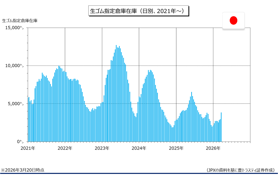 JPXが集計した3月20日時点の生ゴム(RSS)市場指定倉庫在庫は3819トンで、3月10日時点(2916トン)に比べて903トン増加(入庫は1357トン、出庫は454トン、前年同時期の在庫は4017トン)。3旬連続で増加となっております。
