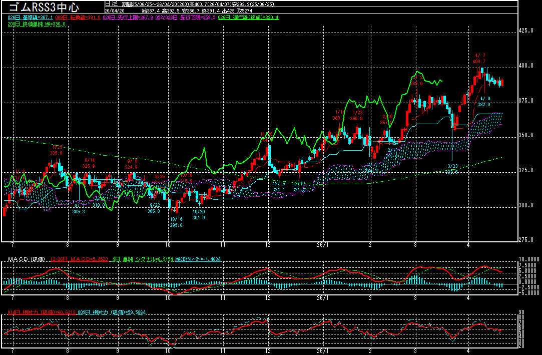 タイでは先週、「水掛け祭り」として知られる伝統行事ソンクラーンが行われましたが、ソンクラーン明けの時期が減産期のピークになり易いと言われております。産地タイの減産期が意識されている上に、テクニカル的に一目均衡表は「三役好転」を維持していることから安値は買い拾われ易くなっております。一方で、原油高が一服している上に、MACDがデッド・クロスを維持する中、上値の重い展開が続いており、しばらくは390円を挟んだ揉み合いが続くことが想定されます。
