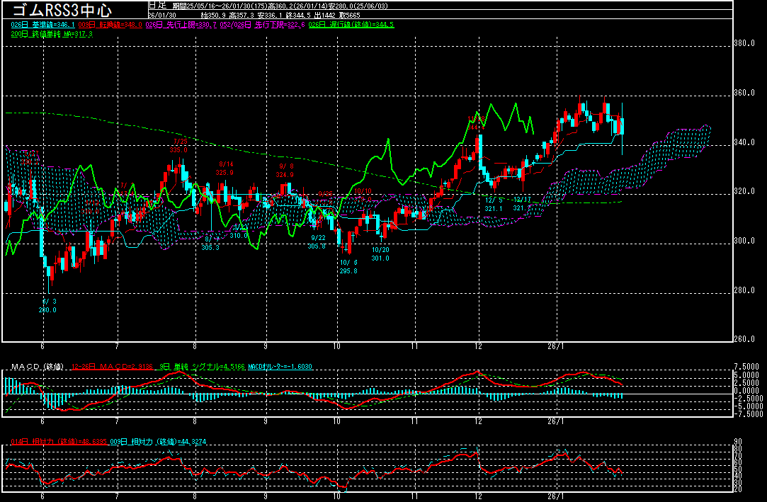 先週末のゴムRSS3(中心限月)は前週比12.8円安の344.5円で終了。8週ぶりに下落に転じました。