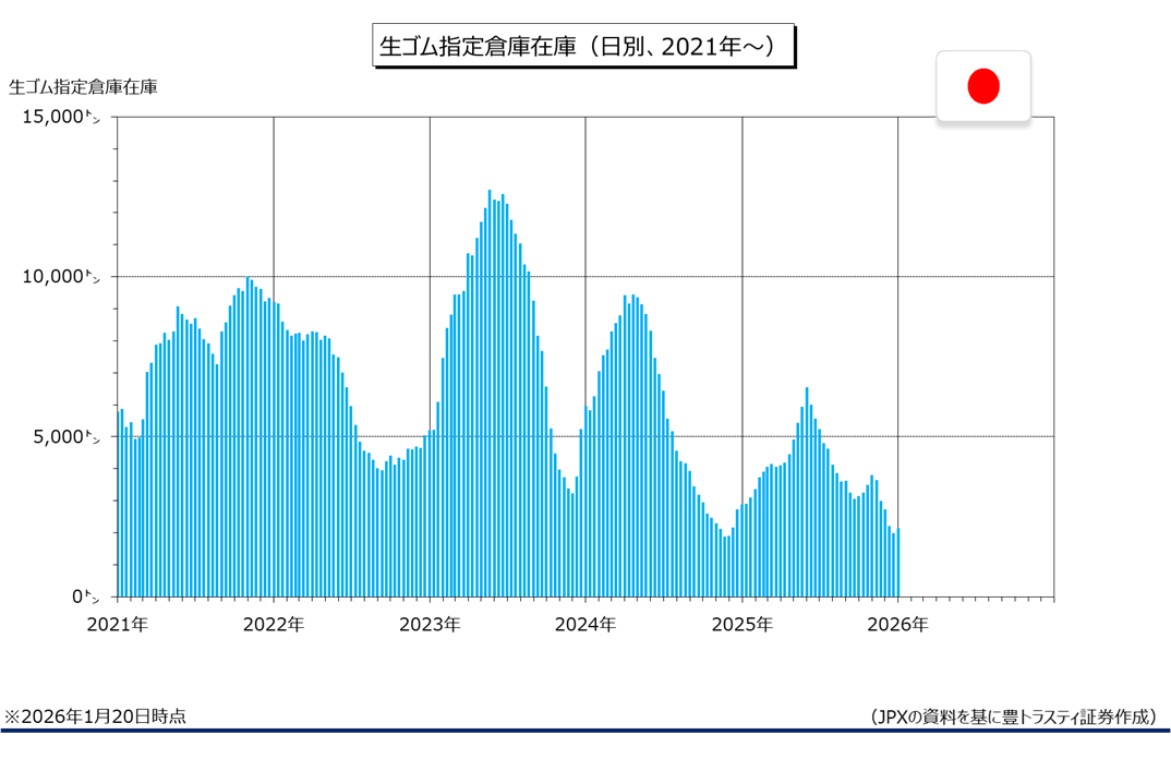 なお、JPXが集計した1月20日時点の生ゴム(RSS)市場指定倉庫在庫は2664トンで、1月10日時点(2399トン)に比べて265トン増加(入庫は636トン、出庫は371トン、前年同時期の在庫は3075トン)。3旬連続で増加となった。