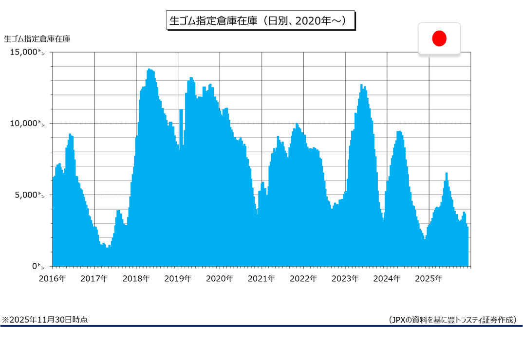 JPXが集計した11月30日時点の生ゴム(RSS)市場指定倉庫在庫は2700トンで、11月20日時点(2948トン)に比べて248トン減少(入庫は321トン、出庫は569トン、前年同時期の在庫は1864トン)。3旬連続で減少となっております。