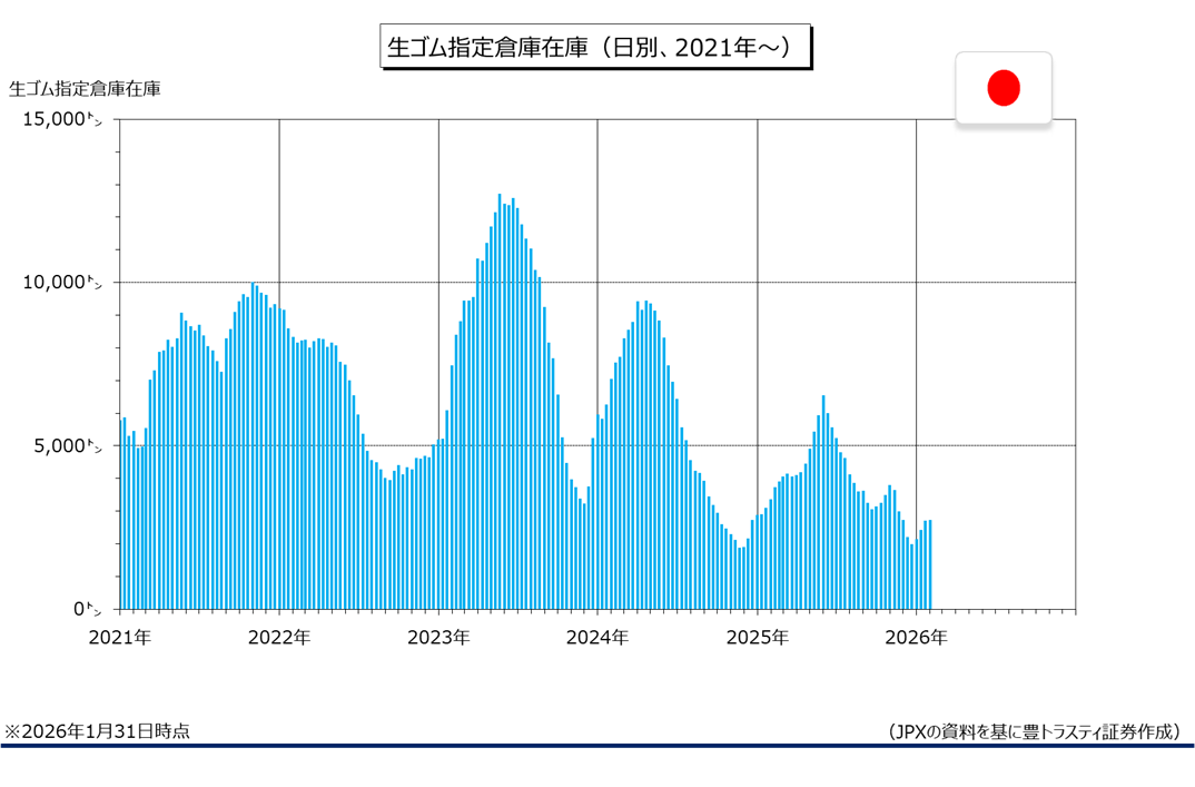 日本取引所グループ(JPX)が集計した1月31日時点の生ゴム(RSS)市場指定倉庫在庫は2692トンで、1月20日時点(2664トン)に比べて28トン増加(入庫は512トン、出庫は484トン、前年同時期の在庫は3318トン)。4旬連続で増加となっております。