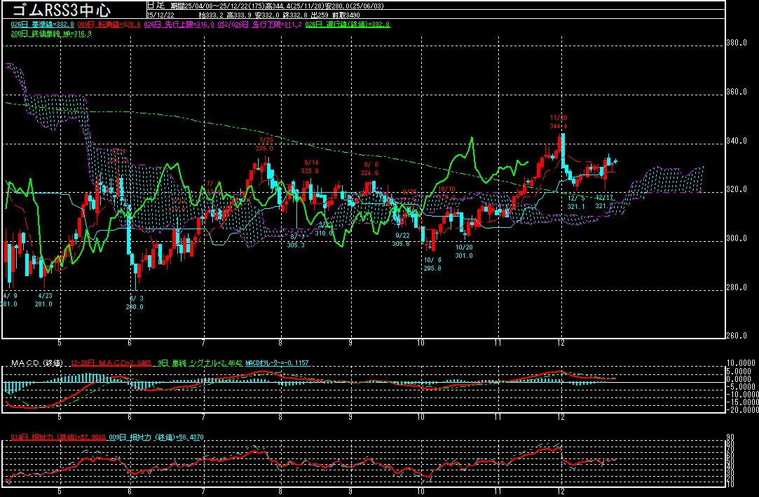 独自材料に乏しいものの、季節的に産地のウインタリング(落葉期)が意識される時期に入って行く中、押し目は買い拾われ易くなっているようです。10月6日を起点としたアップ・トレンドを形成する中、このままMACDがゴールデン・クロスとなり、11月28日の高値344.4円から12月5日の安値321.1円の下げ幅をフィボナッチ・リトレースメントで見た場合の61.8%戻し水準335.5円を上抜くようですと、再度340円超えを試すことも想定されます。
