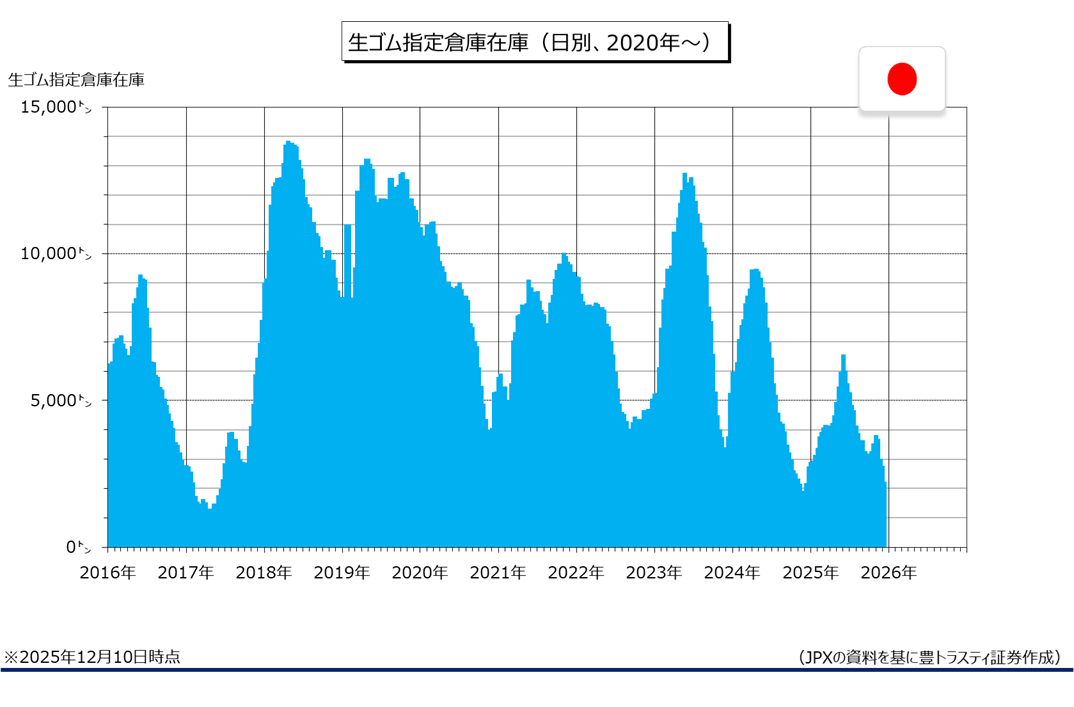 なお、JPXが集計した12月10日時点の生ゴム(RSS)市場指定倉庫在庫は2165トンで、11月30日時点(2700トン)に比べて535トン減少(入庫は235トン、出庫は770トン、前年同時期の在庫は2122トン)。4旬連続で減少となっております。